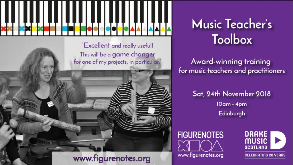 A vibrant group of people attended last week’s Music Teacher’s Toolbox. We had a mix of mainstream teachers, music specialists, music therapists, SEN/ASN teachers, and community musicians. Two teachers travelled all the way from Barcelona, continuing our tradition of attracting an international crowd! “Good to get ideas for using/introducing Figurenotes into classroom teaching. Good to hear […]