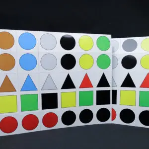 Each sheet contains: 6 red circles; 5 black circles; 2 each of brown, blue, grey, yellow, and green circles; 2 red triangles, 2 black triangles, 1 each of brown, blue and grey triangles; 3 black squares; 2 yellow squares; 2 green squares.